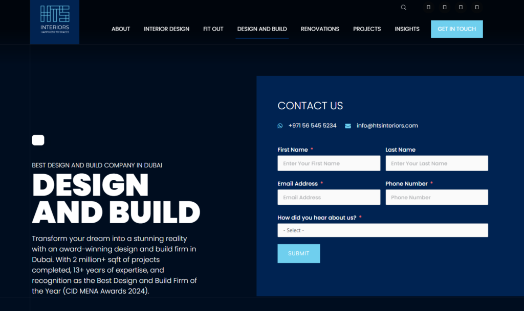 | HTS Interiors | Corporate offices and commercial projects requiring interior design and build with structured delivery | Interior design, space planning, interior fit-out, 3D visualization, turnkey delivery |