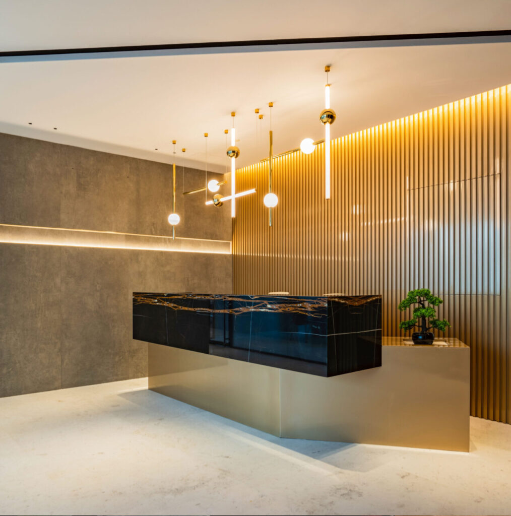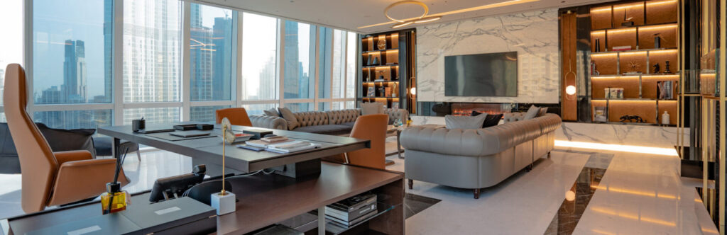 We’ve completed ultra-luxury offices in Alpago Properties, where luxury meets functionality, with opulent materials, such as marbles and high-end office furniture with touches of gold accents.