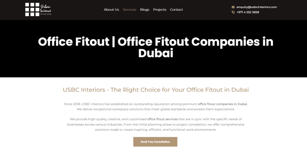 - USBC Interiors: Best for premium, turnkey office fit outs that require a highly structured process, strong project governance, and compliance with international standards.