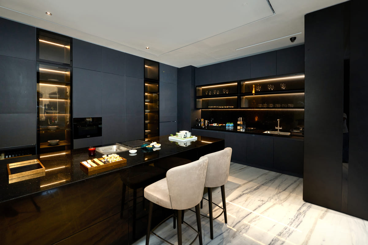 Material contrast became one of the defining design tools. Warm wood flooring and rich veneered wall treatments were paired with sculptural marble surfaces, dark cabinetry, reflective finishes, and soft architectural lighting to achieve a balance of comfort and drama. Signature focal elements, such as the illuminated book-matched stone wall and curated decorative installations, were introduced to reinforce the project’s sense of exclusivity and identity.