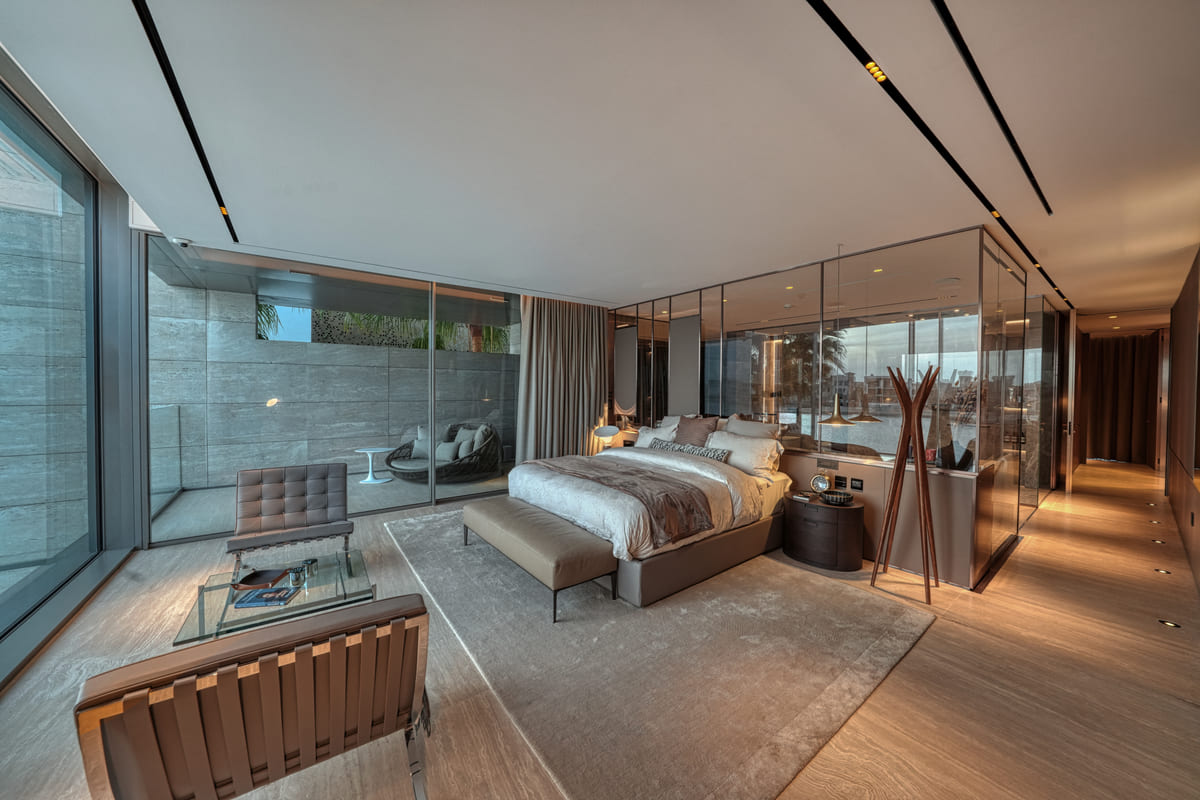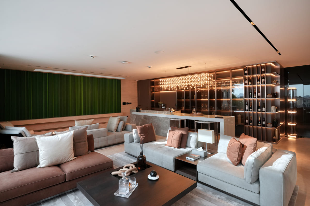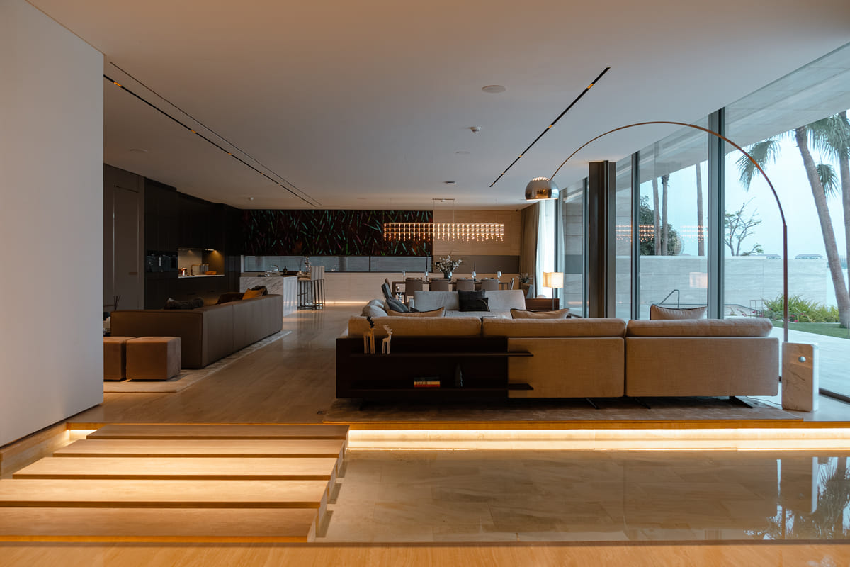 A key challenge was balancing monumentality with livability. The villa’s strong exterior geometry and large glazed elevations had to be matched by interiors that felt warm, composed, and deeply comfortable rather than formal or over-designed. At the same time, the planning needed to support a complete luxury lifestyle — from dramatic arrival spaces and open-plan living to private suites, wellness-focused bathrooms, entertainment areas, and layered outdoor living by the beach.