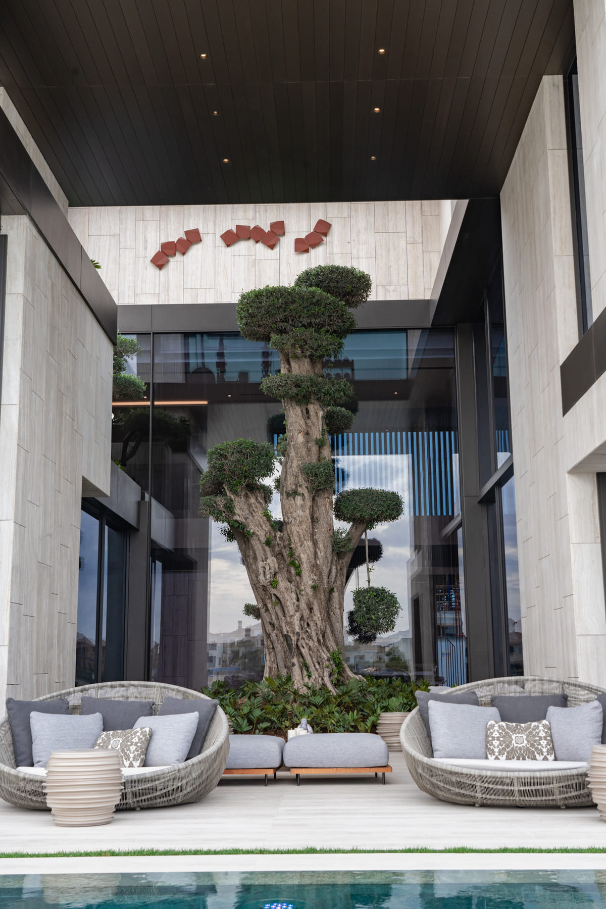 The courtyard became the emotional heart of the residence. Centered around an almost 1,000-year-old tree, it introduces a remarkable sense of age, permanence, and stillness into an otherwise contemporary composition. Rather than serving as a decorative feature, the tree anchors the experience of the home, creating a meditative focal point that connects the architecture to nature in a way that feels rare and deeply intentional. It gives the villa a soul — an element of timelessness that elevates the entire project.
