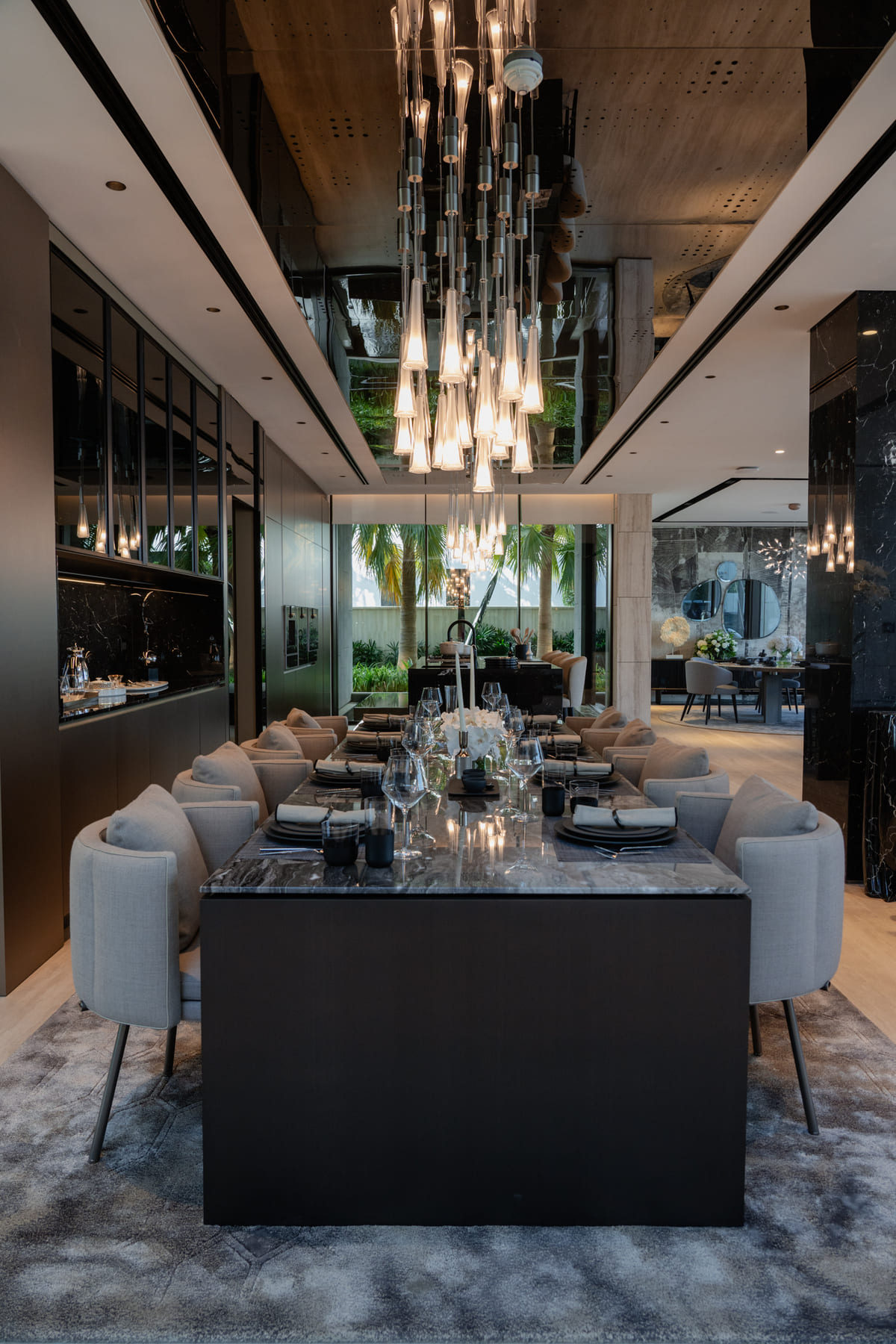 Inside, we developed a refined and atmospheric palette, combining rich stone, dark timber, softly reflective surfaces, warm metallic accents, and carefully curated lighting. Social spaces such as the dining room, lounge areas, bar, and entertainment zones feel immersive and sophisticated, while private spaces are calmer and more intimate, maintaining the same level of material depth and precision without excess.