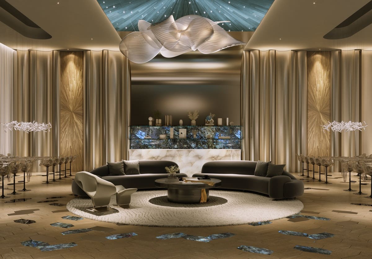 Materially and visually, the concept language is highly sculptural. The interiors are defined by monumental volumes, reflective surfaces, crafted feature walls, layered lighting, dramatic chandeliers, curved forms, and a recurring emphasis on craftsmanship and bespoke artistic detailing. The result is an interior identity that feels expressive, luxurious, and unmistakably custom-made for the client.