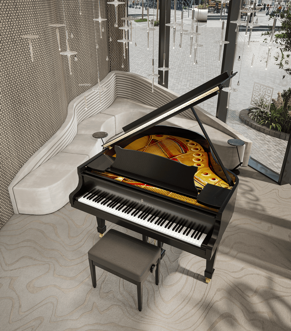 Our approach focused on distilling the essence of the Steinway experience into a smaller, highly curated spatial composition. We centered the design around the piano itself, allowing it to remain the focal point, while surrounding it with fluid architectural gestures, layered textures, and delicate suspended lighting elements that reinforce a sense of rhythm and lightness.