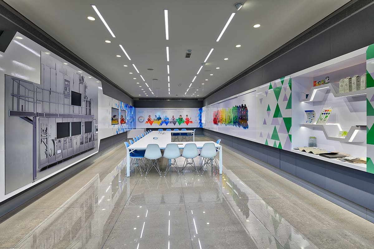 The main challenge was to create a multifunctional office environment that could balance day-to-day operational use with presentation, learning, and brand communication. The space needed to remain efficient and professional while also feeling interactive and visually engaging for visitors.