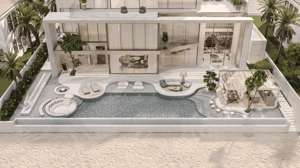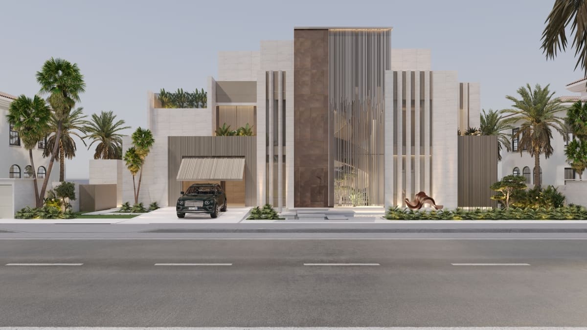 The result is a contemporary Palm Jumeirah villa envisioned as a private sanctuary — one where architecture, interiors, and landscape are brought together through a shared language of sculptural elegance, natural materiality, and quiet luxury. Every layer of the concept supports a home that feels visually memorable, highly resolved, and deeply connected to its setting.