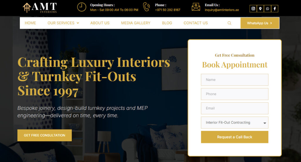 | AMT Interiors | Turnkey residential interior fit-out projects requiring CNC-precision joinery and integrated approvals | Bespoke joinery, interior fit-out, design-build contracting, MEP engineering, authority approvals |